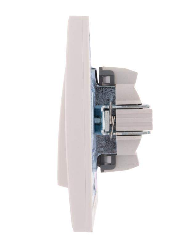 Эстетичный дизайн переключателя выполнен в жемчужно-белом цвете с декоративной металлической рамкой, что позволяет ему гармонично вписаться в большинство современных интерьеров. Монтаж осуществляется стандартным способом в монтажную коробку скрытой проводки. Изделие отличается высоким качеством сборки и долговечностью механизма, обеспечивая комфорт и удобство в повседневном использовании.