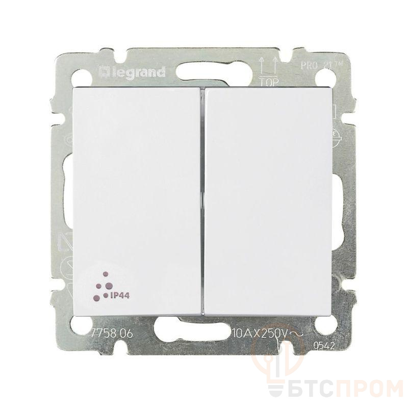 Переключатель двухклавишный IP44 VALENA - 10А 250В схема 6/2 безвинтовые зажимы. Предназначен для установки в электрических сетях жилых и общественных зданий и используется для управления приборами освещения, вентиляции и т.д. Используется для независимой коммутации двух нагрузок и управления нагрузкой с одного, двух или более мест (совместно с промежуточными выключателями). Обладает повышенной степенью пылевлагозащиты IP44 и подходит для установки в помещениях с повышенной влажностью.