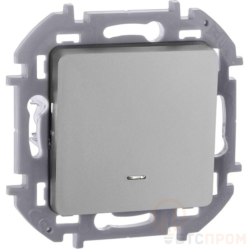 Выключатель одноклавишный с подсветкой/индикацией скрытого монтажа Inspiria, цвет "Алюминий", номинальный ток 10АХ, напряжение ~250В, безвинтовые зажимы. Устанавливается в жилых и общественных помещениях для управления приборами освещения, вентиляции и т.д.