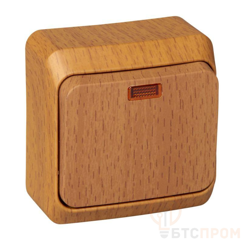 Выключатель Systeme Electric (ранее Schneider Electric) ЭТЮД (бук, открытой установки) одноклавишный предназначен для применения в сетях до 250В, на ток до 10А. Наличие подсветки делает его легко находимым при отсутствии освещения. Выключатель подходит для большинства типов ламп, включая люминесцентные. Изделия цвета Бук обладают уникальным рисунком, напоминающим древесный сруб. Сделано в России.