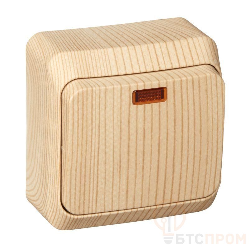 Выключатель Systeme Electric (ранее Schneider Electric) ЭТЮД (сосна, открытой установки) одноклавишный предназначен для применения в сетях до 250В, на ток до 10А. Наличие подсветки делает его легко находимым при отсутствии освещения. Выключатель подходит для большинства типов ламп, включая люминесцентные. Изделия цвета Сосна обладают уникальным рисунком, напоминающим древесный сруб. Сделано в России.
