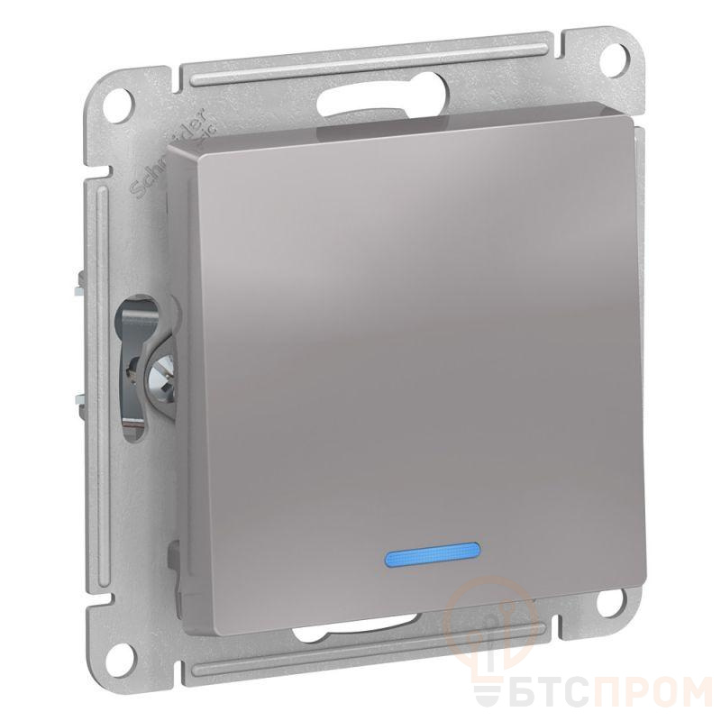 Механизм выключателя 1-клавишного с подсветкой Systeme Electric (ранее Schneider Electric) серии AtlasDesign в цвете алюминий подходит для сетей 250 В, на ток 10 А. - Благодаря светодиодной подсветке синего цвета изделие легко найти в темноте. - Усиленные прямые монтажные лапки для лучшей фиксации механизма в монтажной коробке. - Лицевые детали из качественного ABS-пластика, устойчивого к царапинам и УФ-излучению.
