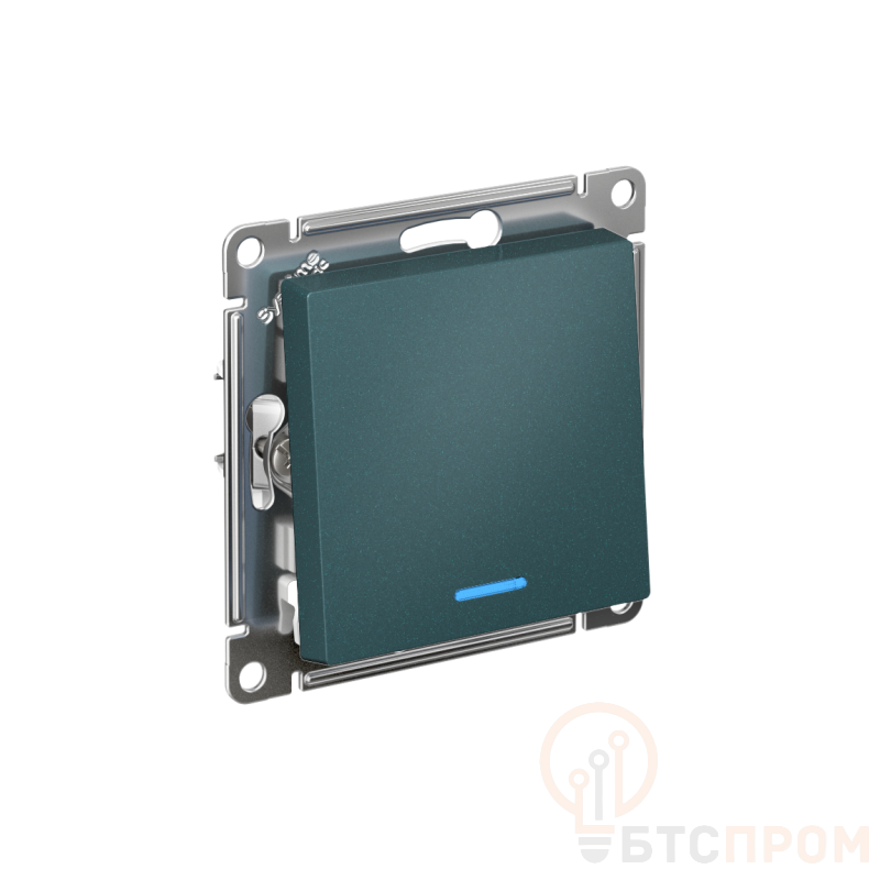 Механизм выключателя 1-клавишного с подсветкой Systeme Electric (ранее Schneider Electric) серии AtlasDesign в цвете изумруд подходит для сетей 250 В, на ток 10 А. - Благодаря светодиодной подсветке синего цвета изделие легко найти в темноте. - Лицевые детали из качественного ABS-пластика, устойчивого к царапинам и УФ-излучению. - Усиленные прямые монтажные лапки для лучшей фиксации механизма в монтажной коробке.