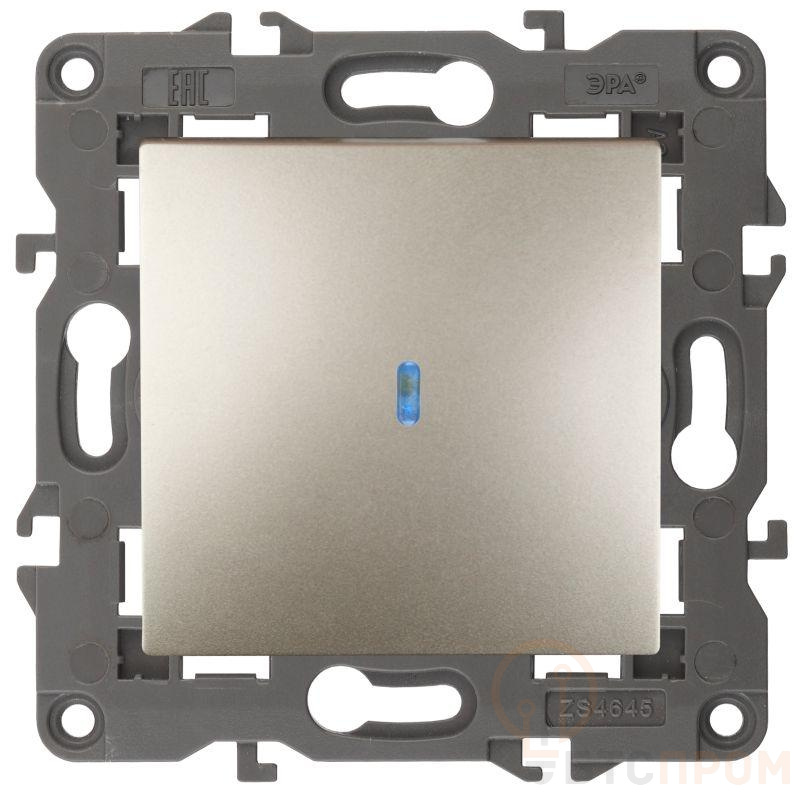 Выключатель 1-клавишный подсветка Эра Elegance шампань 14-1102-04. Оснащён автоматическими клеммами для надёжной фиксации жил кабеля в механизме. Рамки приобретаются отдельно.