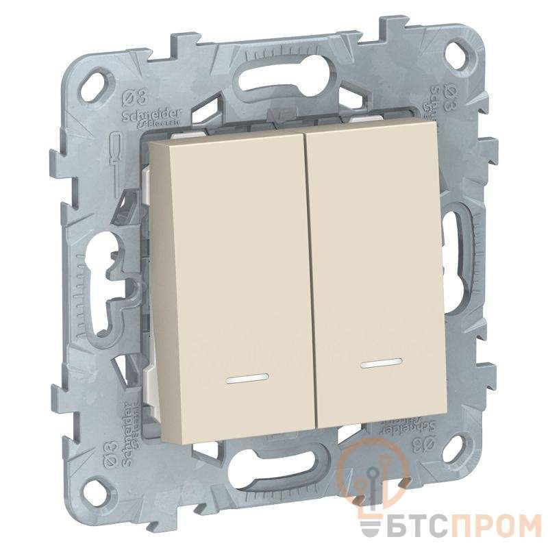 Выключатель двухклавишный Schneider Electric UNICA NEW (бежевый) с подсветкой предназначен для сетей до 250 В на ток до 10 А. - 2 нормально открытых контакта. - Подсветка делает выключатель легко находимым в отсутствие освещения. - Двухклавишный выключатель позволяет управлять двумя источниками света из одной точки.
