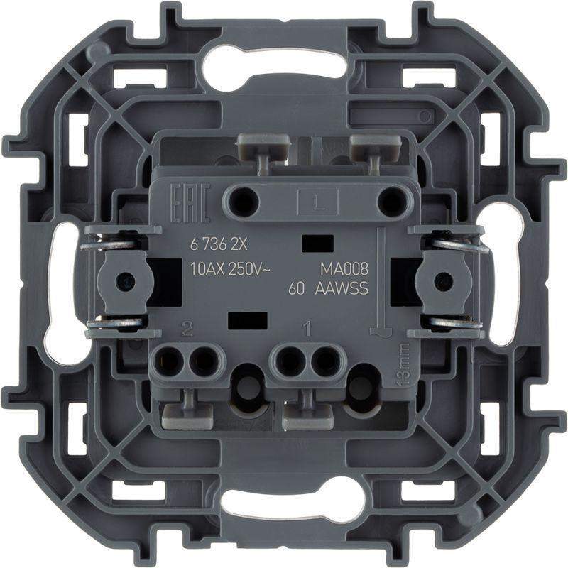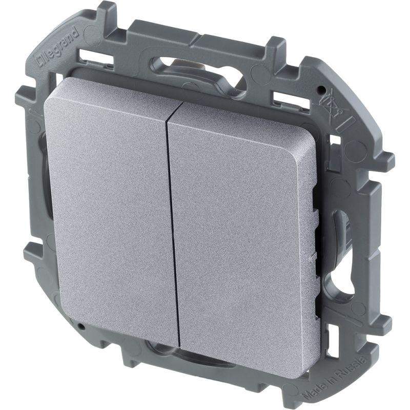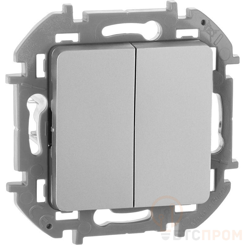 Выключатель двухклавишный скрытого монтажа Inspiria, цвет "Алюминий", номинальный ток 10АХ, напряжение ~250В, безвинтовые зажимы. Устанавливается в жилых и общественных помещениях для управления приборами освещения, вентиляции и т.д. Предназначен для управления двумя электрическими цепями.