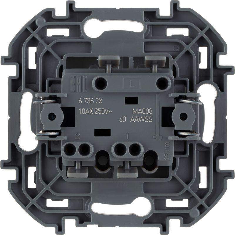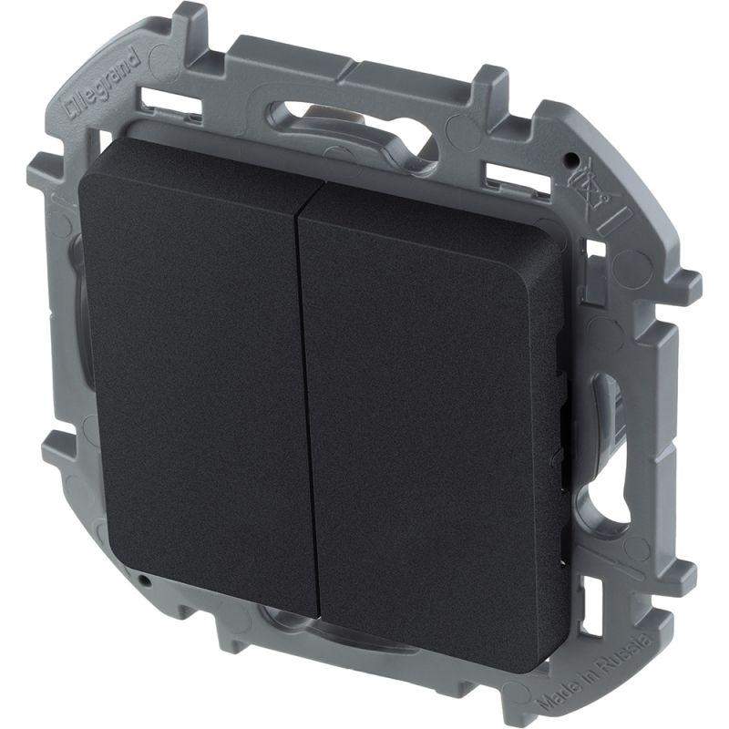 Выключатель двухклавишный скрытого монтажа Inspiria, цвет "Антрацит", номинальный ток 10АХ, напряжение ~250В, безвинтовые зажимы. Устанавливается в жилых и общественных помещениях для управления приборами освещения, вентиляции и т.д. Предназначен для управления двумя электрическими цепями.
