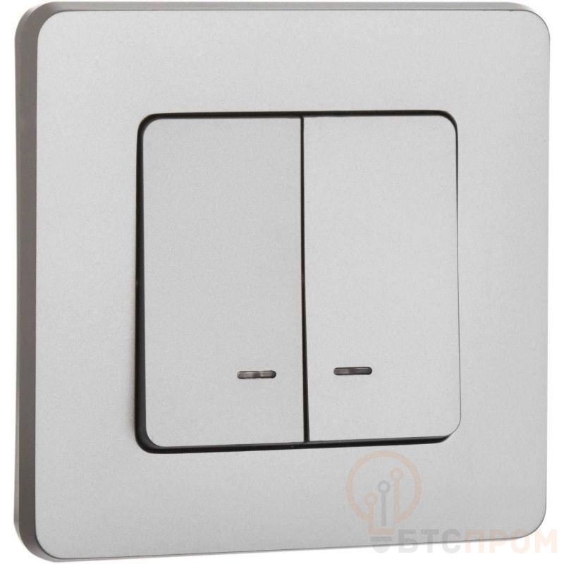 Выключатель двухклавишный с подсветкой/индикацией скрытого монтажа Inspiria, цвет "Алюминий", номинальный ток 10АХ, напряжение ~250В, безвинтовые зажимы. Устанавливается в жилых и общественных помещениях для управления приборами освещения, вентиляции и т.д. Предназначен для управления двумя электрическими цепями.