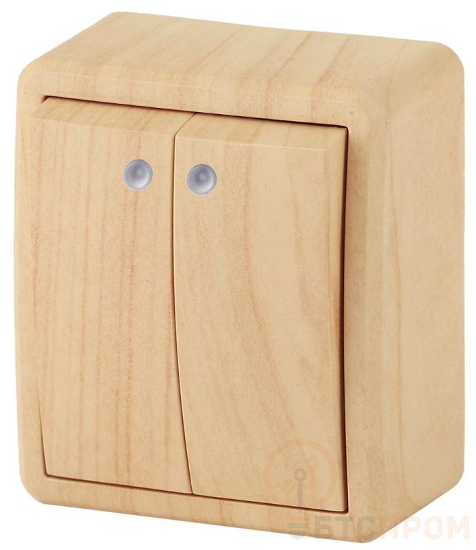 Выключатель 2-клавишный с подсветкой серии Эра Эксперт открытой установки цвет сосна 11-1205-11. Номинальные характеристики 10А 250В. Выключатель выполнен из качественного поликарбоната, оснащён уникальными винтовыми клеммами ЭКСПЕРТ для максимально качественного зажима кабеля в механизме.