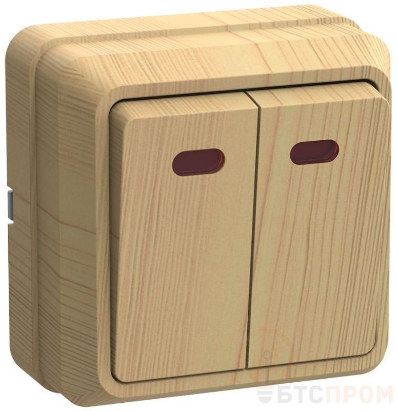 Выключатель 2-кл. ОП Этюд Дача 10А IP20 с подсветкой сосна SE BA10-006D