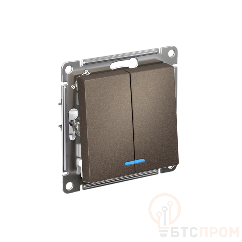Механизм Systeme Electric (ранее Schneider Electric) серии AtlasDesign в цвете мокко выключателя 2-клавишного c подсветкой подходит для сетей 250 В, на ток 10 А. - Благодаря светодиодной подсветке синего цвета изделие легко найти в темноте. - Двухклавишный выключатель позволяет управлять двумя источниками света с одной точки. - Лицевые детали из качественного ABS-пластика, устойчивого к царапинам и УФ-излучению.