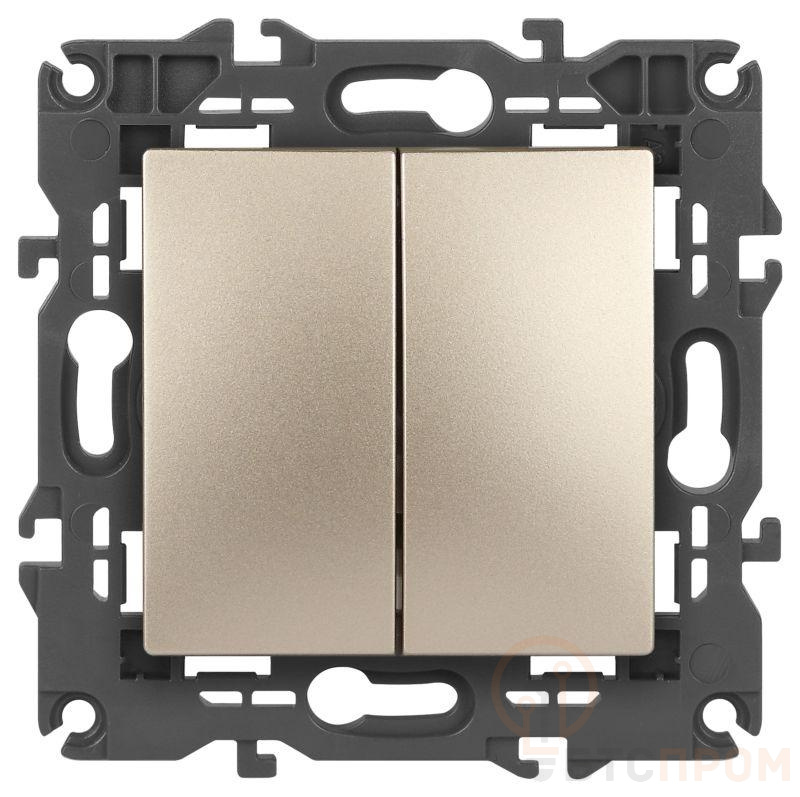 Выключатель 2-клавишный Эра Elegance шампань 14-1104-04. Оснащён автоматическими клеммами для надёжной фиксации жил кабеля в механизме. Рамки приобретаются отдельно.