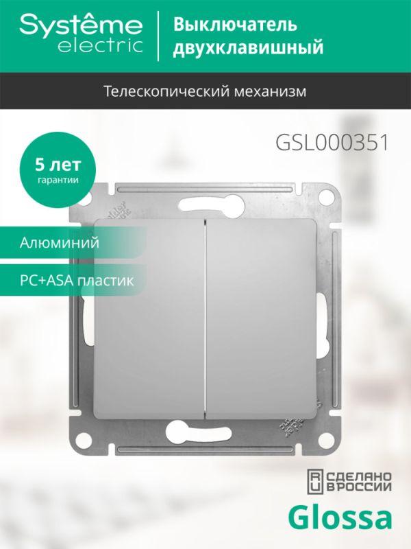 Механизм Systeme Electric (ранее Schneider Electric) серии Glossa (цвет алюминий) выключателя 2-клавишного подходит для сетей 250 В, на ток 10 А. - Двухклавишный выключатель позволяет управлять двумя источниками света с одной точки. - Выполнен из материала PС+ASA, стойкого к УФ-излучению и появлению царапин. - Эргономичные клеммы расположены в два ряда: сверху и снизу.