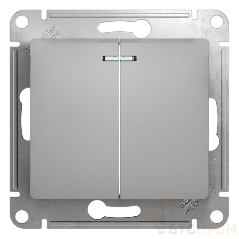 Механизм Systeme Electric (ранее Schneider Electric) серии Glossa (цвет алюминий) выключателя 2-клавишного c подсветкой подходит для сетей 250 В, на ток 10 А. - Благодаря современной светодиодной подсветке зеленого цвета изделие легко найти в темноте. - Двухклавишный выключатель позволяет управлять двумя источниками света с одной точки. - Выполнен из материала PС+ASA, стойкого к УФ-излучению и появлению царапин. - Эргономичные клеммы расположены в два ряда: сверху и снизу.