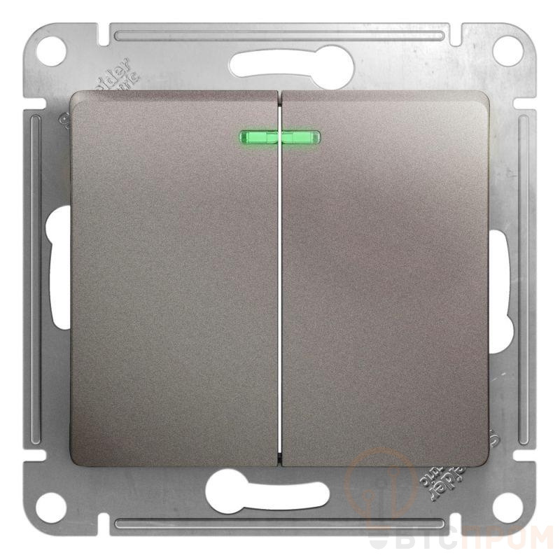 Механизм Systeme Electric (ранее Schneider Electric) серии Glossa (цвет платина) выключателя 2-клавишного c подсветкой подходит для сетей 250 В, на ток 10 А. - Благодаря современной светодиодной подсветке зеленого цвета изделие легко найти в темноте. - Двухклавишный выключатель позволяет управлять двумя источниками света с одной точки. - Выполнен из материала PС+ASA, стойкого к УФ-излучению и появлению царапин. - Эргономичные клеммы расположены в два ряда: сверху и снизу.