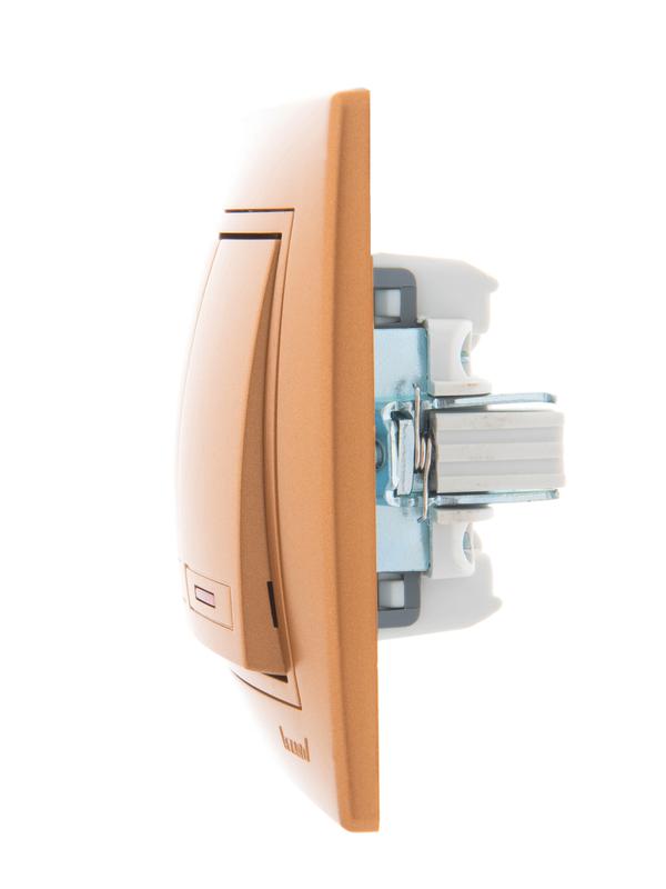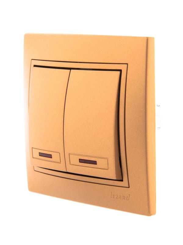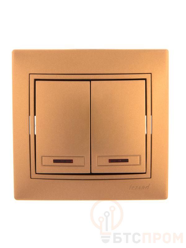 Выключатель 2-кл. СП Mira 10А IP20 с подсветкой со вставкой зол. метал. LEZARD 701-1313-112 фото в каталоге от BTSprom.by