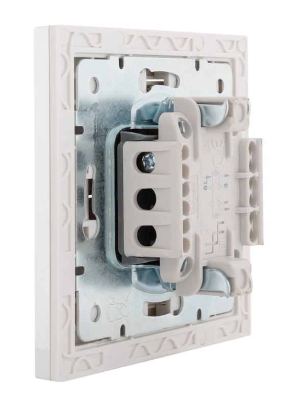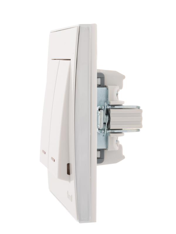 Корпус прибора выполнен в классическом белом цвете, который гармонично дополнен элегантной боковой вставкой из хрома. Эта деталь придает выключателю современный и завершенный вид. Важной особенностью является наличие подсветки, которая обеспечивает удобное ориентирование в помещении в темное время суток.