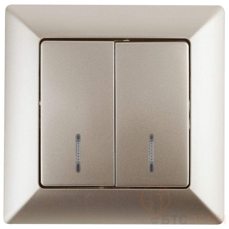 <table> <tbody> <tr> <td>Выключатель Intro Solo 4-105-04 двухклавишный с подсветкой, 10А-250В, IP20, СУ, шампань</td> </tr> </tbody> </table>