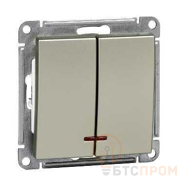 Механизм W59 (цвет шампань) выключателя 2-клавишного с подсветкой подходит для сетей 250 В, на ток до 10 А. - Двухклавишный выключатель позволяет управлять двумя источниками света с одной точки. - Благодаря подсветке изделие легко найти в темноте. - Серебряные контактные группы выключателей обеспечивают надёжный электрический контакт и пожаробезопасность. - Корпус изделия выполнен из высококачественного ABS-пластика.