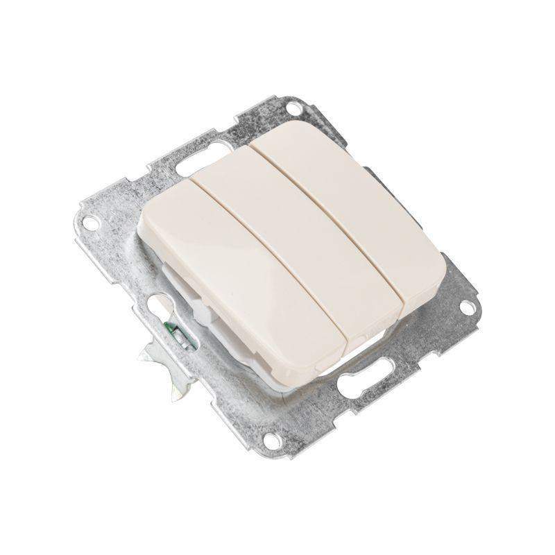 Трехклавишный выключатель скрытой установки предназначен для организации электроснабжения внутри помещения. Применяется для включения и выключения источников света. Благодаря лаконичной форме корпуса и нейтральному бежевому цвету выключатель гармонично впишется в любой интерьер. Рамка серии DEA приобретается отдельно, доступны разные цвета на выбор. Сечение проводников: 1,5-2,5 мм2. Высота над встраиваемой поверхностью: 0,9 см. Материал механизма: бакелит.
