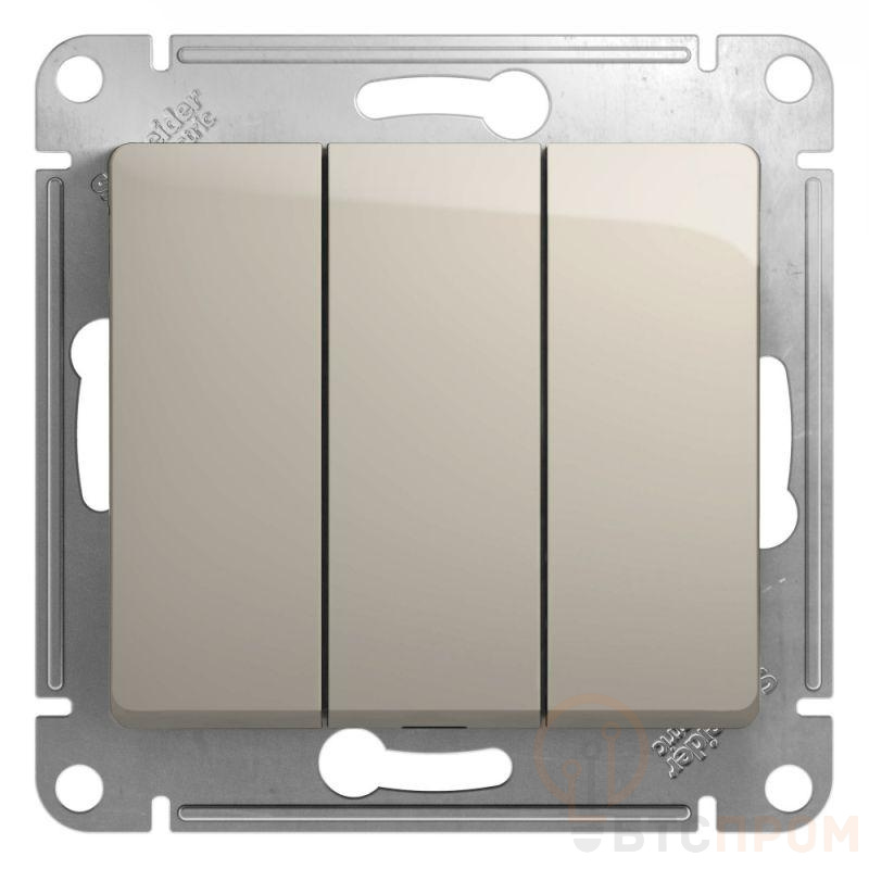 Механизм Systeme Electric (ранее Schneider Electric) серии Glossa (цвет молочный) выключателя 3-клавишного подходит для сетей 250 В, на ток 10 А. - Трёхклавишный выключатель позволяет управлять тремя источниками света из одной точки. - Выполнен из материала PС+ASA, стойкого к УФ-излучению и появлению царапин. - Эргономичные клеммы расположены в два ряда: сверху и снизу.