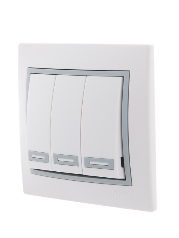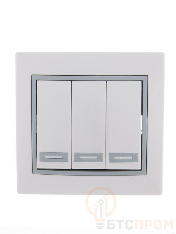 Выключатель 3-кл. СП Mira 10А IP20 с сер. вставкой бел. LEZARD 701-0215-109 фото в каталоге от BTSprom.by