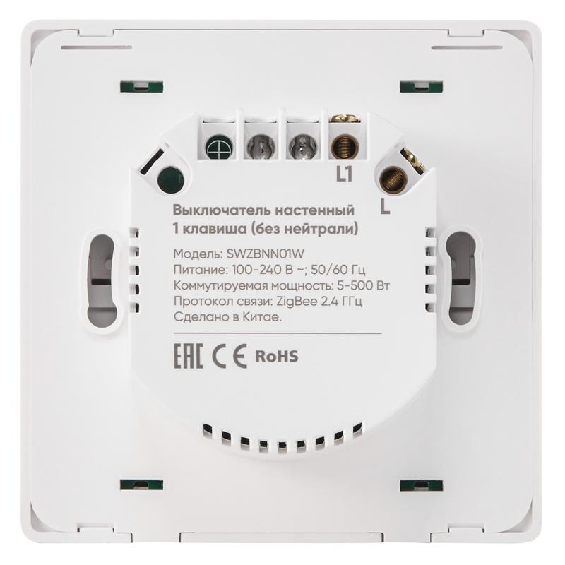 Выключатель HOMMYN настенный zigbee 1 клавиша (без нейтрали) Одноклавишный умный выключатель выполнен в стильном, безрамочном, минималистичном дизайне, с приятным тактильным нажатием клавиш со светодиодными индикаторами. Управляет включением и выключением освещения с кнопки, удаленно через приложение или с помощью голосового помощника Алиса или Маруся. Работает с приложением Hommyn (для подключения требуется Zigbee хаб Hommyn. Подключается напрямую к станциям Алиса от Яндекс с Zigbee и работает в приложении Умный Дом с Алисой. Компактный размер позволяет провести монтаж в стандартный круглый подрозетник вместо обычного «неумного» выключателя. Для подключения выключателя требуется только питающая линия L, нулевая линия N (нейтраль) не требуется. Основные функции: · включает и выключает освещение по кнопкам, через приложение или с помощью голосовых помощников Алиса и Маруся; · поддерживает настройку по расписанию через приложение; · монтируется в стандартный круглый подрозетник вместо обычного «неумного» выключателя; · для подключения к электроцепи не требуется нулевая линия N (нейтраль), необходима только питающая линия L (фаза); · работает с приложением Hommyn; · работает с приложением Умный Дом с Алисой; · поддерживает сценарии автоматизации с другими датчиками и приборами в приложении Умный Дом с Алисой; · для подключения в приложение требуется либо Zigbee хаб Hommyn, либо станции Алиса от Яндекс с Zigbee. Установка и настройка Монтаж и подключение производится в соответствии с руководством пользователя, прилагаемым к продукту. Нулевая линия N не требуется.