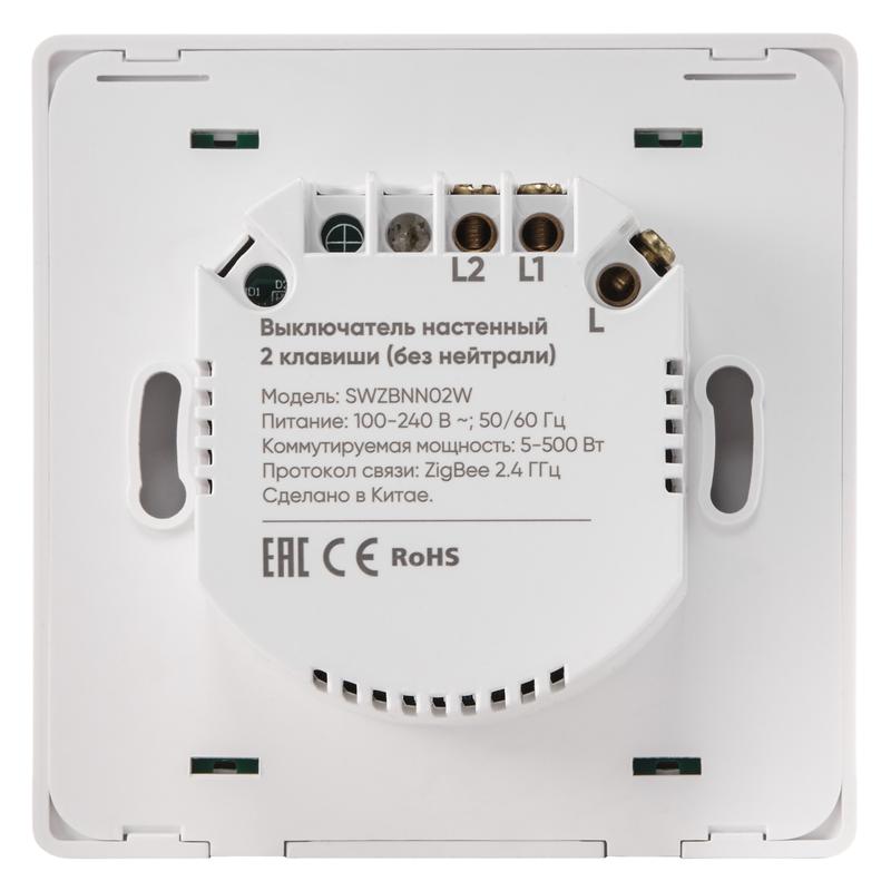 Выключатель HOMMYN настенный zigbee 2 клавиши (без нейтрали) Двухклавишный умный выключатель выполнен в стильном, безрамочном, минималистичном дизайне, с приятным тактильным нажатием клавиш со светодиодными индикаторами. Управляет включением и выключением освещения с кнопки, удаленно через приложение или с помощью голосового помощника Алиса или Маруся. Работает с приложением Hommyn, для подключения требуется Zigbee хаб Hommyn. Подключается напрямую к станциям Алиса от Яндекс с Zigbee и работает в приложении Умный Дом с Алисой. Компактный размер позволяет провести монтаж в стандартный круглый подрозетник вместо обычного «неумного» выключателя. Для подключения выключателя требуется только питающая линия L, нулевая линия N (нейтраль) не требуется. Основные функции: · включает и выключает освещение по кнопкам, через приложение или с помощью голосовых помощников Алиса и Маруся; · поддерживает настройку по расписанию через приложение; · монтируется в стандартный круглый подрозетник вместо обычного «неумного» выключателя; · для подключения к электроцепи не требуется нулевая линия N (нейтраль), необходима только питающая линия L (фаза); · работает с приложением Hommyn; · работает с приложением Умный Дом с Алисой; · поддерживает сценарии автоматизации с другими датчиками и приборами в приложении Умный Дом с Алисой; · для подключения в приложение требуется либо Zigbee хаб Hommyn, либо станции Алиса от Яндекс с Zigbee. Установка и настройка Монтаж и подключение производится в соответствии с руководством пользователя, прилагаемым к продукту. Нулевая линия N не требуется.