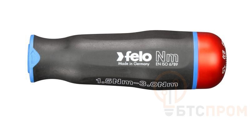 Динамометрическая рукоятка Felo серии Nm предназначены для сборки ответственных электротехнических соединений, с заданным значением крутящего момента силы. Рукоятка имеет диапазон затягивания от 1,5 до 3,0 Нм (с шагом в 0,1 Нм). Гладкая бесшовная рукоятка Nm имеет усовершенствованную эргономичную форму, удобно ложится в руку, не проскальзывает и и снижает утомляемость. Каждая рукоятка индивидуально откалибрована и сертифицирована. С рукояткой применяются сменные стержни длиной 170мм, изготовленные из закаленной в масле хром-молибден-ванадиевой стали, износостойкость которой превышает технические требования DIN и ISO. Важно: нагружать отвертку следует равномерно, плавно и по часовой стрелке. Достижение заданного момента затяжки сопровождается щелком. Как только заданный момент затяжки достигнут, необходимо прекратить дальнейшую нагрузку на отвертку. Механизм блокируется при вращении против часовой стрелки (на ослабление винтов). Если стрелка переместилась за пределы шкалы повернув регулировочный ключ по часовой стрелке повторно выровняйте шкалу и стрелку.