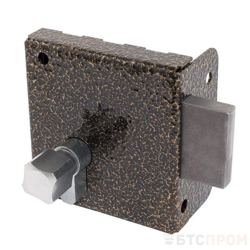 Замок накладной с цилиндровым механизмом. Предназначен для установки на деревянные и легкие металлические двери, Подходит для тамбурных дверей, т.к. вертушка не имеет фиксированных положений. Комплектация - 5 перфорированных ключей, запорная планка, накладка. Закрывание и открывание замка изнутри - вертушкой, снаружи - ключом.