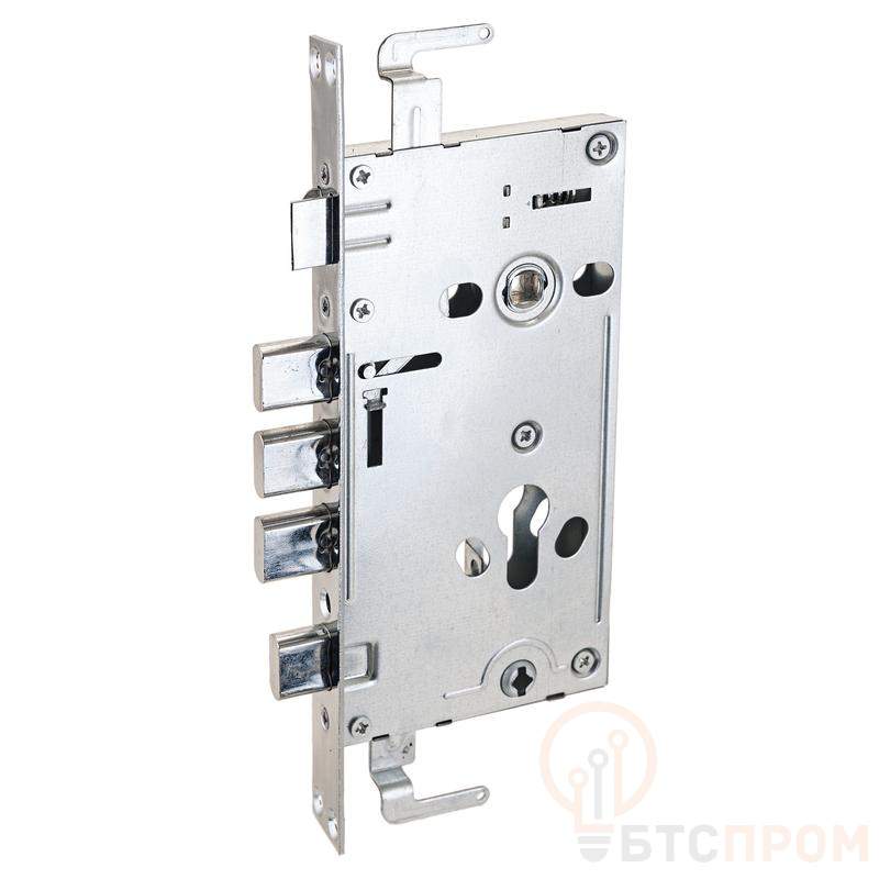 Замок врезной цилиндровый с защелкой и задвижкой, без механизма секрета. Предназначен для установки в китайские металлические двери, в качестве основного замка. Реверсивная защелка позволяет устанавливать замок на правые и левые двери. Три прямоугольных стальных ригеля. Вылет ригелей 20мм. 3 точки запирания. Корпус замка - сталь, толщиной 1,1мм. Удаление ключевого отверстия 60мм. Межосевое расстояние 68мм. Расстояние от центра механизма секрета до задвижки 52мм. Цвет торцевой планки - хром, ширина 24мм.