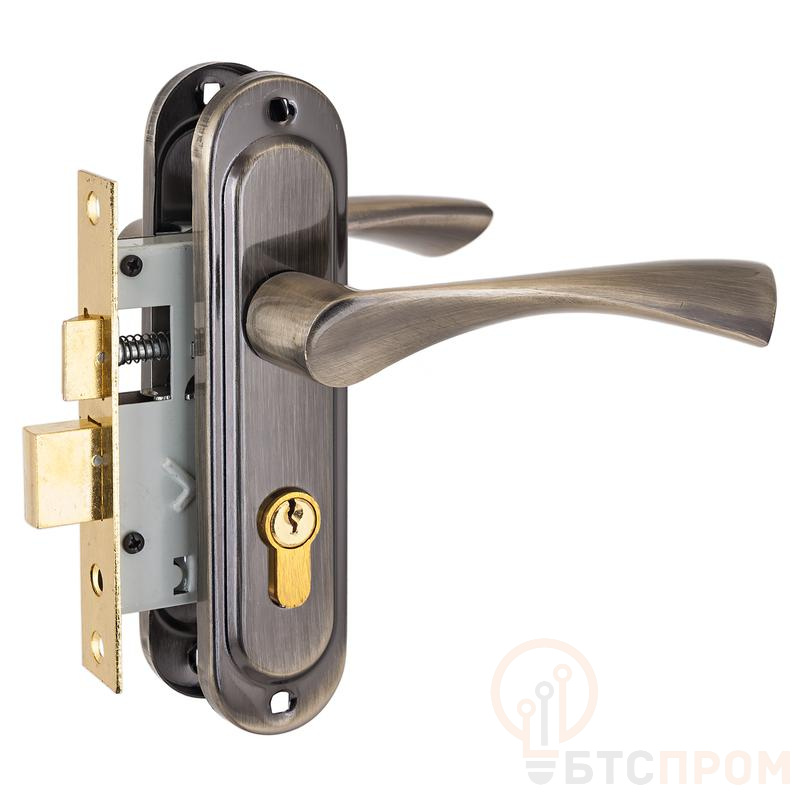 СТАНДАРТ 103/50 AB старая бронза Замок врезной с/руч (30), Замок врезной с ручками. Предназначен для установки в деревянные двери толщиной до 40мм, правого и левого открывания. Дверь может быть закрыта на защелку и открыта с помощью фалевой ручки при открытом засове замка. Прямоугольный ригель, вылет 16мм. Универсальная защелка. Стальной корпус, покрытие эмаль. Межосевое расстояние 50мм. Удаление ключевого отверстия 40мм. Гальваническое покрытие ручек, материал алюминий. Механизм секрета с уменьшеной высотой профиля, длина ц/м 68 мм, ключ-ключ, 5 ключей, цвет цилиндра - латунь.