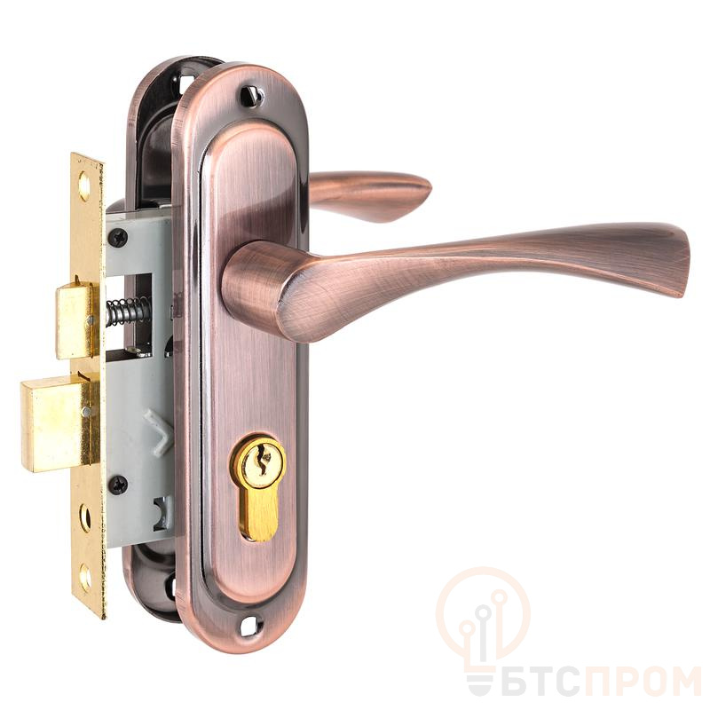 СТАНДАРТ 103/50 AC старая медь Замок врезной с/руч (30), Замок врезной с ручками. Предназначен для установки в деревянные двери толщиной до 40мм, правого и левого открывания. Дверь может быть закрыта на защелку и открыта с помощью фалевой ручки при открытом засове замка. Прямоугольный ригель, вылет 16мм. Универсальная защелка. Стальной корпус, покрытие эмаль. Межосевое расстояние 50мм. Удаление ключевого отверстия 40мм. Гальваническое покрытие ручек, материал алюминий. Механизм секрета с уменьшеной высотой профиля, длина ц/м 68 мм, ключ-ключ, 5 ключей,цвет цилиндра - латунь.