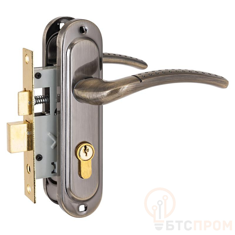 СТАНДАРТ 132/50 AB старая бронза Замок врезной с/руч (30), Замок врезной с ручками. Предназначен для установки в деревянные двери толщиной до 40мм, правого и левого открывания. Дверь может быть закрыта на защелку и открыта с помощью фалевой ручки при открытом засове замка. Прямоугольный ригель, вылет 16мм. Универсальная защелка. Стальной корпус, покрытие эмаль. Межосевое расстояние 50мм. Удаление ключевого отверстия 40мм. Гальваническое покрытие ручек, материал алюминий. Механизм секрета с уменьшеной высотой профиля, длина ц/м 68 мм, ключ-ключ, 5 ключей,цвет цилиндра - латунь.