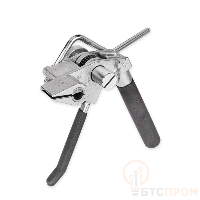 Конструкция включает переставную рукоятку, которая позволяет менять положение для удобства работы в стесненных условиях и оптимального приложения усилия. Инструмент совмещает две ключевые функции: натяжение и резку ленты с помощью встроенного резака, что ускоряет процесс и исключает необходимость в дополнительных приспособлениях.