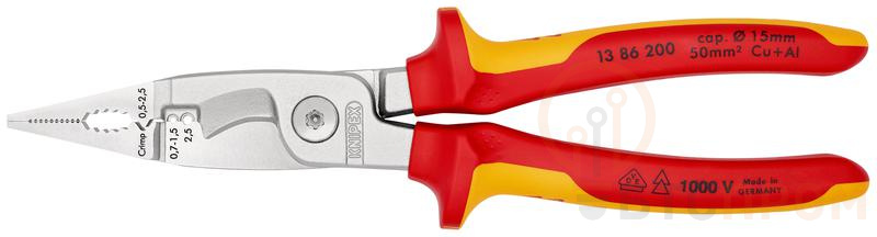 Профессиональные клещи электромонтажные Knipex 1386200SB — это универсальный инструмент для комплексного выполнения задач. Модель объединяет шесть функций в одном: резка кабеля, снятие изоляции с проводов сечением 0.2–6.0 мм², обжим изолированных и неизолированных контактов, точная резка PCBA-плат и зачистка коаксиального кабеля.
