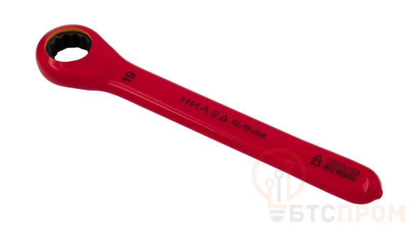 Ключ накидной храповой(трещоточный) изолированный используется для откручивания и закручивания болтовых соединений на распределительных устройствах, кабельных и воздушных линиях. Трещоточный механизм позволяет применять ключ в ограниченном пространстве, обеспечивая высокий крутящий момент. Инструменты, изготовлены в соответствии с ГОСТ IEC 60900-2019 - способствуют повышению безопасности пользователей в случае их применения квалифицированными специалистами в соответствии с безопасными методами работы и инструкциями по эксплуатации (при необходимости). Материал головки - CrMo Материал рукояти - CrV Материал изоляции - PVC (пластизоль) Твердость головки - 52-56 HRC Твердость рукояти - 42-50 HRC Размер головки, мм - 19