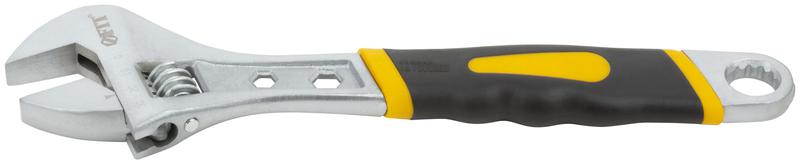 Ключ разводной ‘’Старт’’ FIT IT — универсальный инструмент для сантехнических и слесарных работ, заменяющий целый набор обычных рожковых ключей! Ключ изготовлен из штампованной термообработанной инструментальной стали с хромированным покрытием. Накидной ключ, встроенный в рукоятку, делает данное изделие многофункциональным. Удобная эргономичная рукоятка с ПВХ-накладкой не скользит в руке во время работы. Размерная шкала позволяет точно настроить ключ.