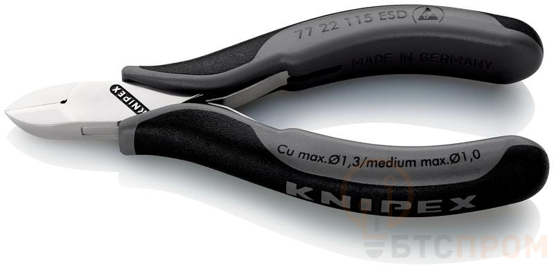 Бокорезы ESD круглая головка режущая кромка без фаски L-115мм антистатические твердость режущих кромок 57 HRC Knipex KN-7722115ESD