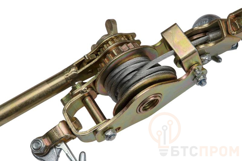 Лебедка ручная представляет собой грузоподъемный механизм, таль которого выполнена из стального троса, приводной барабан выполнен из металлической обоймы и стального основания, снабжена блочным механизмом, что позволяет увеличить тяговое усилие. Возможна работа без блочного механизма, что позволяет увеличить длину тали вдвое, при снижении тягового усилия. Рукоятка выполнена из металла, соединенная с храповым механизмом. Механзим оснащен тремя скоростями - нейтраль (блокирует заданное тяжение), основная (производит натяжение тали), реверс (снижает тяжение тали). Лебедка оснащена крюками с обеих сторон, крюк имеет подпружиненный ограничитель, во избежание соскальзывания крюка с закрепляемой поверхности. Дополнительный - третий крюк закреплен на тросе и фиксируется через блок на корпусе лебедки, облегчая процесс перестройки режима работы лебедки (с блоком/ без блока). Лебедка предназначена для изменения тяжения кабельно-проводниковой продукции на электроустановки посредством дополнительных устройств. Длина тали, мм - 1200 Статическая нагрузка с блоком, кг - 3000