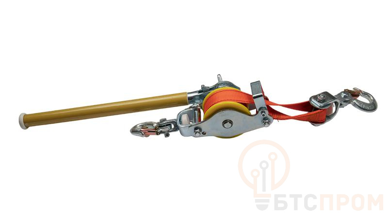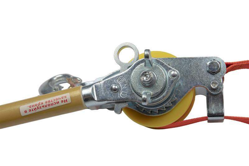 Лебедка ручная представляет собой грузоподъемный механизм, таль которого выполнена из нейлоновой стропы, приводной барабан выполнен из металлической обоймы и диэлектрического основания, снабжена блочным механизмом, что позволяет увеличить тяговое усилие. Возможна работа без блочного механизма, что позволяет увеличить длину тали вдвое, при снижении тягового усилия. Рукоятка выполнена из диэлектрического материала, соединенная с храповым механизмом. Механзимо оснащен тремя скоростями - нейтраль (блокирует заданное тяжение), основная (производит натяжение тали), реверс (снижает тяжение тали). Лебедка оснащена крюками с обеих сторон, крюк имеет подпруживенный ограничитель, во избежание соскальзывания крюка с закрепляемой поверхности. На корпусе лебедки расположен захватный мезанизм в виде кольца, что позволяет производить установку лебедки при помощи штанг, в случае выполнения работ под напряжением. Лебедка предназначена для изменения тяжения кабельно-проводниковой продукции на электроустановки посредством дополнительных устройств. Длина тали, мм - 3000 Ширина тали, мм - 50 Статическая нагрузка с блоком, кг - 1500