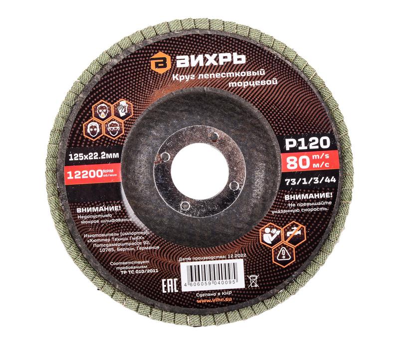 Круг лепестковый торцевой 125х22.2 мм с зернистостью Р120 от бренда «Вихрь» — это высокоэффективный абразивный инструмент для финишной обработки поверхностей. Основой инструмента служит прочная фибра, на которую радиально наклеены прямоугольные лепестки из наждачной бумаги. Такая конструкция обеспечивает гибкость и равномерный износ абразива в процессе работы, значительно продлевая срок его службы.