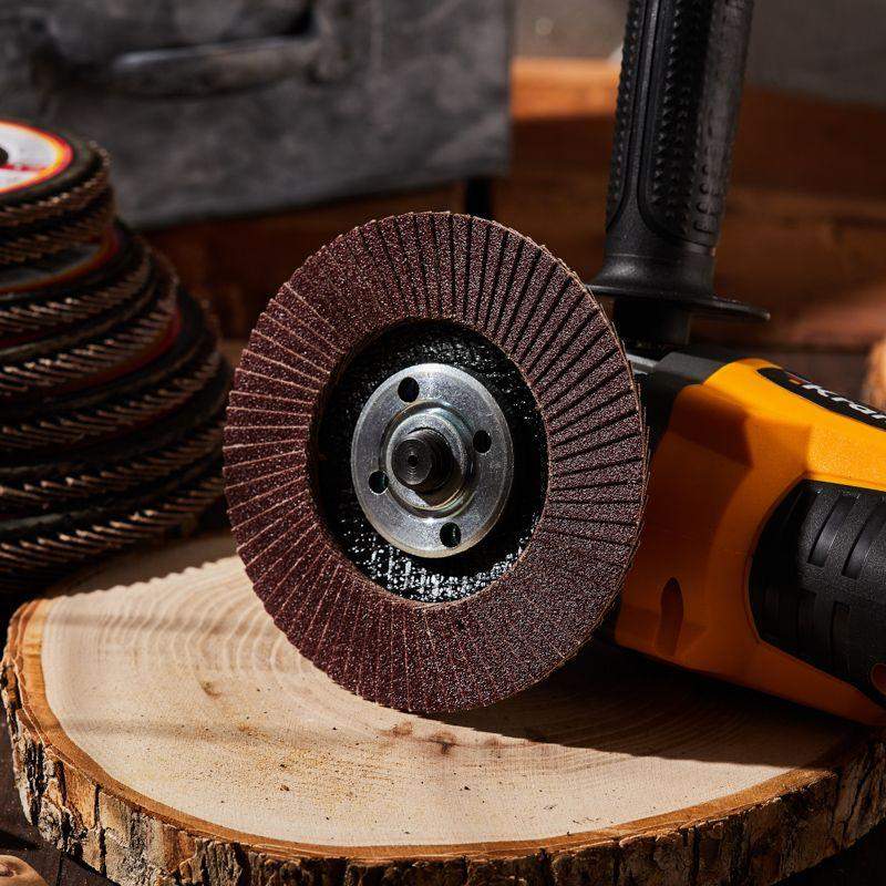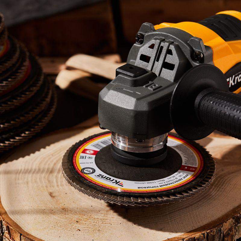 Лепестковый торцевой круг применяется совместно с ручными угловыми шлифовальными машинами (болгарками) соответствующего диаметра. Шлифовальные диски предназначены для предварительной, промежуточной и финишной обработки металла, дерева, пластика и других материалов. Конструктивная особенность кругов – веерное расположение лепестков абразивного материала, что обеспечивает плавную работу круга и отсутствие перегрева в зоне шлифования. Лепестковый круг изготовлен из шлифовальной шкурки на тканевой основе. Благодаря торцевому типу диска (T-29) увеличивается пятно контакта, что повышает скорость обработки поверхности и уменьшает возможность возникновения дефектов в виде зарезов, ям и прижогов. Тканевая основа лепестков равномерно изнашивается в процессе работы и открывает следующий слой абразива, позволяя полностью использовать ресурс круга. Наружный диаметр – 115 мм, посадочный – 22,2 мм. Max 12200 RPM.