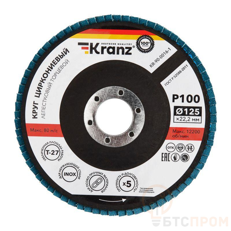 Шлифовальный циркониевый круг предназначен для обработки нержавеющей стали, металла, сварных швов, пластика, дерева. Устанавливается на угловые шлифовальные машины. При изготовлении круга используется высококачественный гибкий абразивный материал, состоящий из тканевой основы, на которую нанесен слой циркониевого электрокорунда. Круг на основе циркониевого электрокорунда имеет наиболее высокую прочность, что эффективно при работе с особо твердыми легированными сортами металла. Структура циркониевого электрокорунда дает эффект самозатачивания и меньше подвержена перегреву, что увеличивает ресурс использования. Конструктивная особенность круга – веерное расположение лепестков абразивного материала. Это обеспечивает плавную работу и отсутствие перегрева в зоне шлифования. Торцевой тип диска (T-27) создает увеличенное пятно контакта, что повышает скорость обработки поверхности и уменьшает возможность возникновения дефектов в виде зарезов, ям и прижогов. Количество лепестков – 72. Max 12200 RPM.