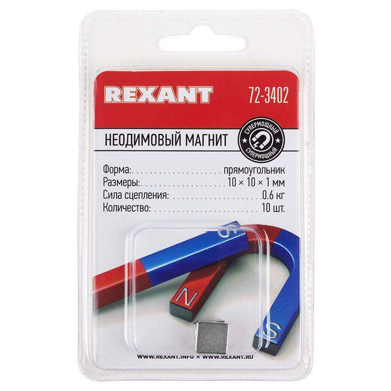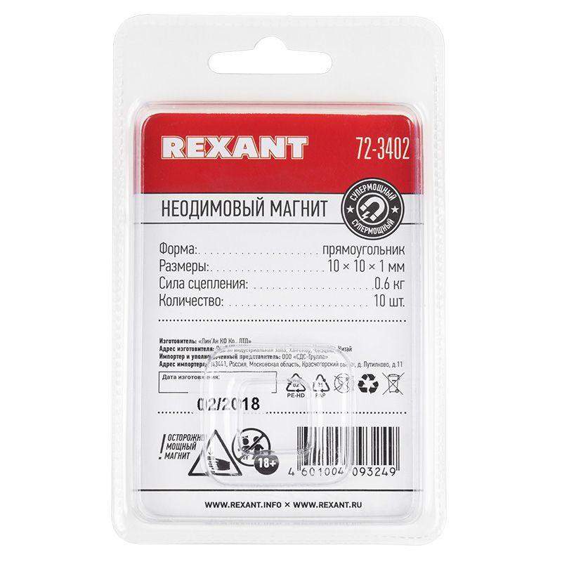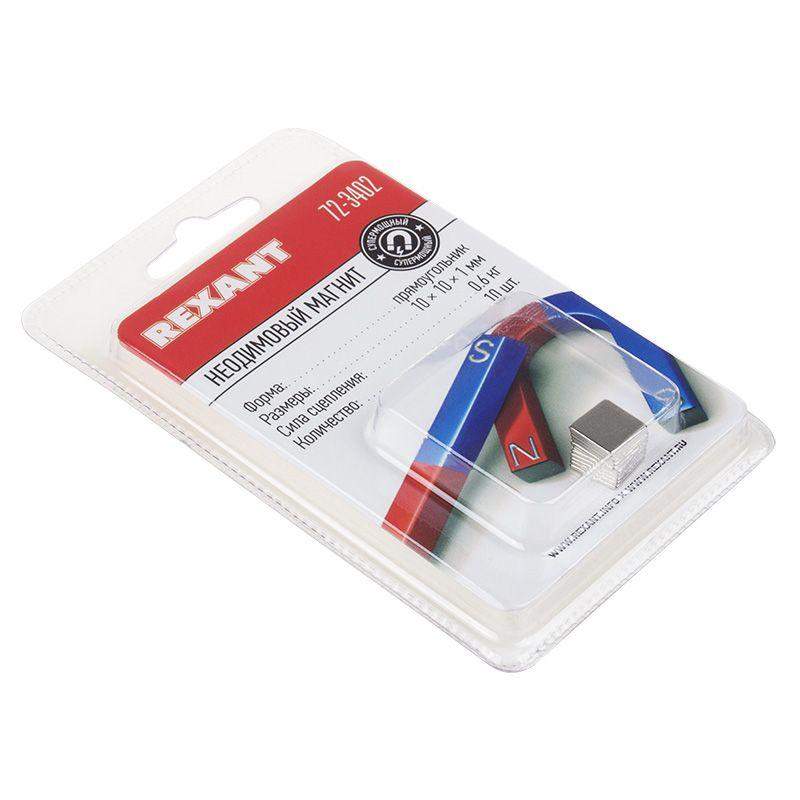 Магнит неодимовый прямоугольник 10х10х1мм сцепление 0.6кг (блист.10шт) Rexant 72-3402 фото в каталоге от BTSprom.by