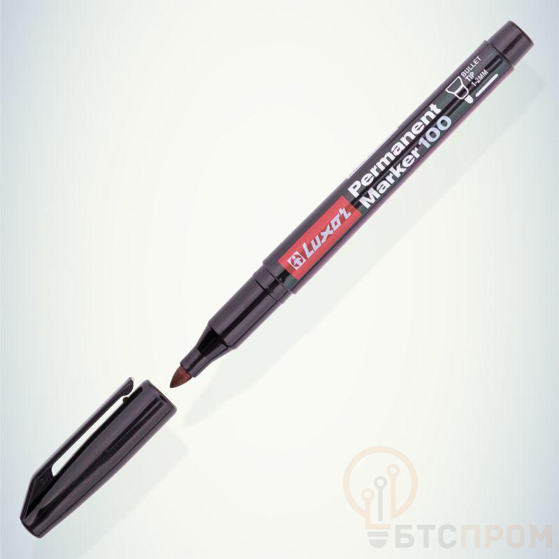 Маркер перманентный Luxor «100» на спиртовой основе. Используется для письма на изделиях из: бумаги, пластика, металла, стекла, резины, кожи, ткани. Не смазывается, не разбрызгивается и не растекается при нанесении Чернила содержат высокую концентрацию пигмента, что позволяет им хорошо ложиться на гладкие и шероховатые поверхности. Обладают свето-, влаго- и термостойкостью Пулевидная форма наконечника не оставляет царапин при письме. Чернила высыхают на поверхности в течение нескольких секунд. Корпус изделия выполнен из прочного ABS-пластика. Перед началом использования необходимо встряхнуть маркер.