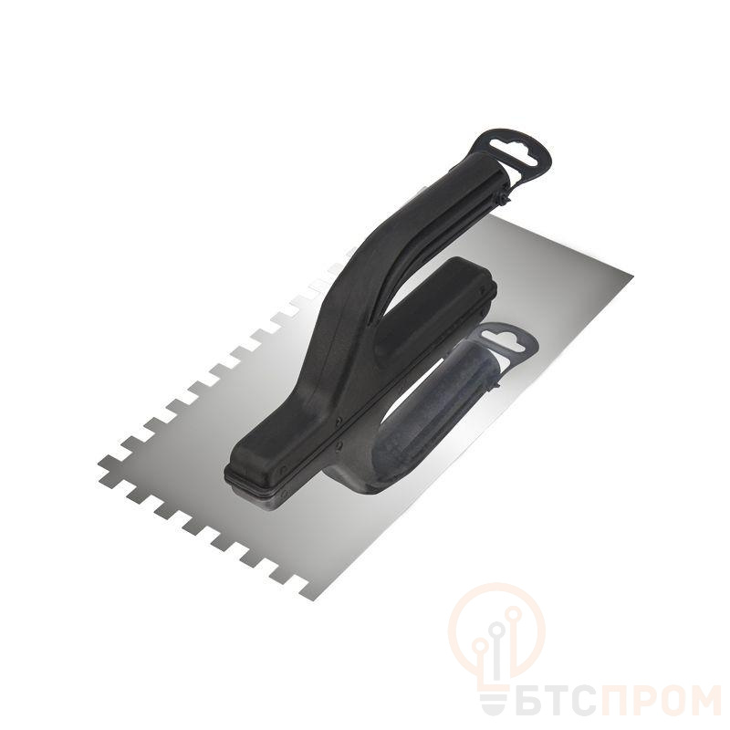 Гладилка прямая (зубчатая) изготовлена из нержавеющей стали, оснащена эргономичной пластиковой ручкой. Используется для качественного нанесения различных сухих смесей, их распределения по поверхности, а также сглаживания неровностей и швов. В ремонтных, а также отделочных работах гладилка малярная и штукатурная используется повсеместно. Она незаменима в случаях, когда необходимо нанести много раствора тонким слоем. Применяется для шпаклевки, обычной и декоративной штукатурки, клея и различных строительных смесей. Характеристики: Материал рукоятки: пластик Материал рабочего полотна: нержавеющая сталь марки AISI 430 Ширина рабочего полотна: 130х270 мм Размер зубчика (ШхВ): 8х8 мм Отверстие для подвеса: есть