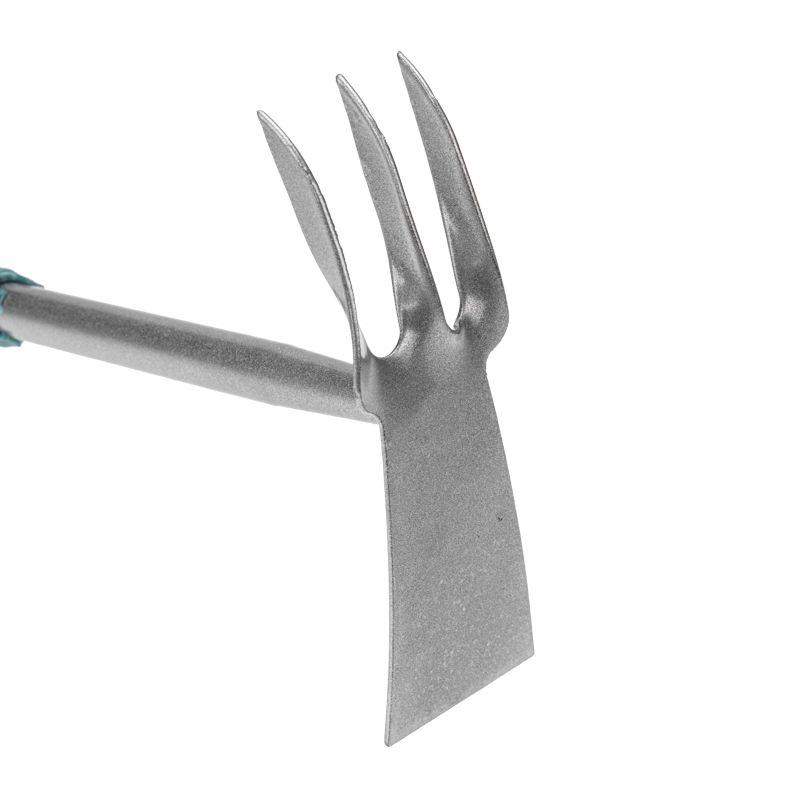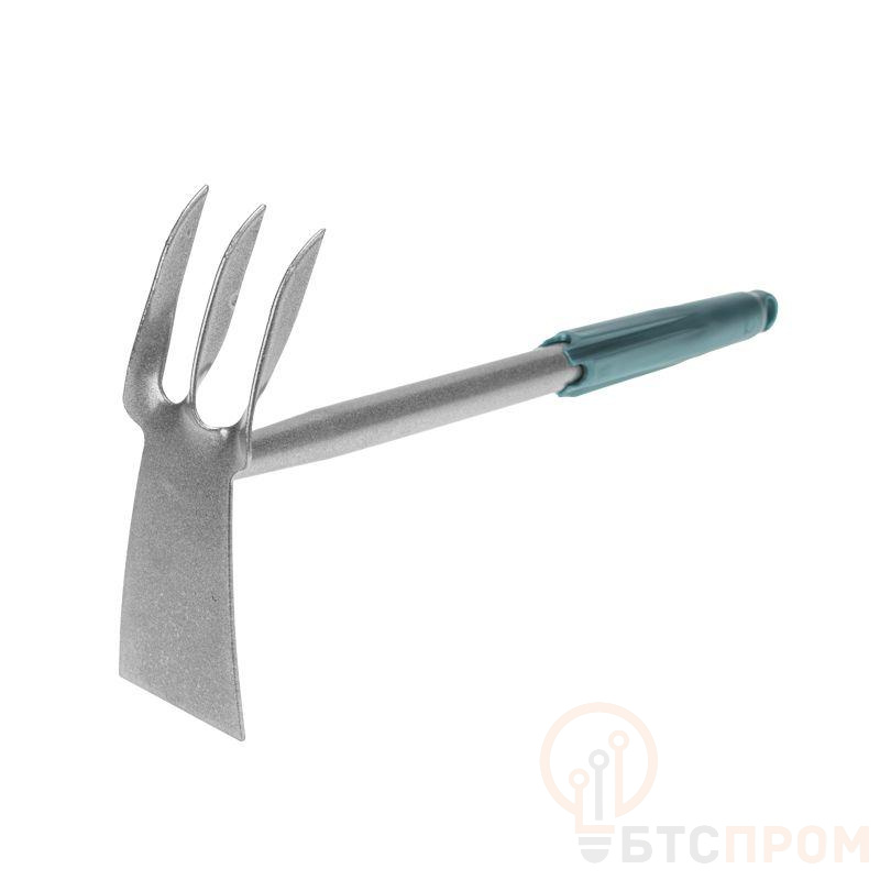 Мотыжка используется при выполнении работ в садах, огородах, цветниках и т.д. Применяется для рыхления почвы, формирования рядов для посева, прополки сорняков и многого другого. Рабочая часть и рукоятка выполнены из метала с порошковым покрытием, благодаря чему грабли обладают долговечностью, прочностью и надежностью. Конструктивно рабочая часть состоит из лопатки и 3 витых зубцов. Cверху рукоятка покрыта пластиком, что препятствует скольжению инструмента в руке и создает комфорт при выполнении работ. Также в рукоятке предусмотрено отверстие, позволяющее размещать мотыжку на вертикальных поверхностях, что обеспечивает удобство хранения и позволяет экономить место на рабочем пространстве.