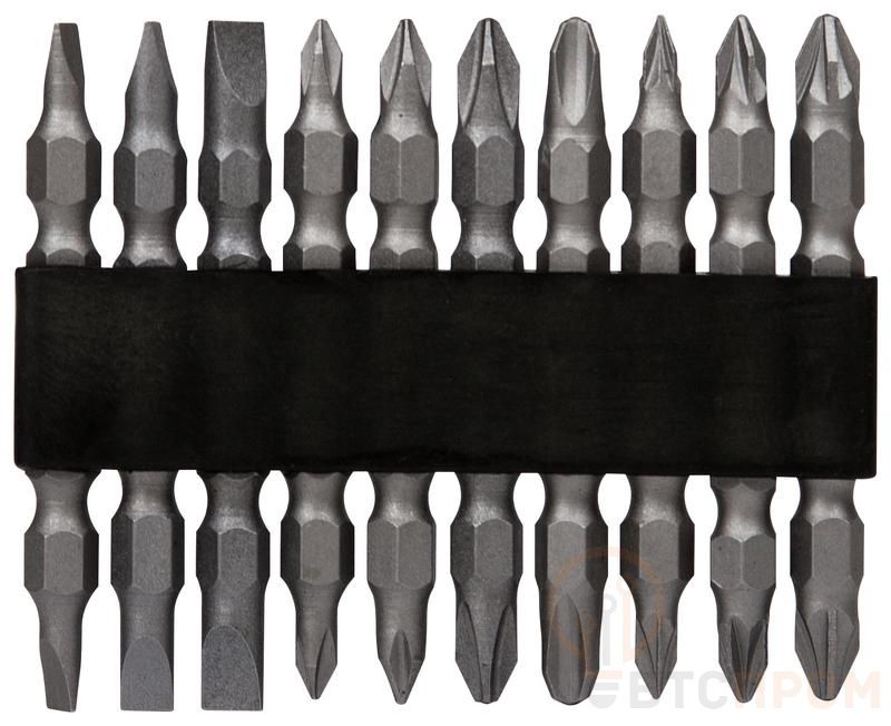 Набор бит FIT – это универсальный набор двухсторонних бит, предназначенный для завинчивания и отвинчивания шурупов с разными типами шлицев. Биты изготовлены из хромованадиевой стали CrV, которая обладает высокой прочностью и долговечностью. Набор включает десять бит длиной 50 мм с разными типами шлицев на каждой стороне, что позволяет выполнять различные работы.