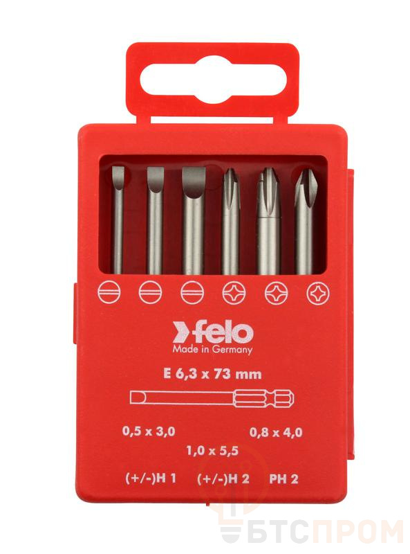 Felo Набор из 6 бит SL/H (+/-) Industrial 70 мм в кейсе размерами SL 0,5x3,0 / 0,8x4,0 / 5,5x1,0; H 1 / H 2 и PH2. Набор предназначен для работ с различного рода крепежом.